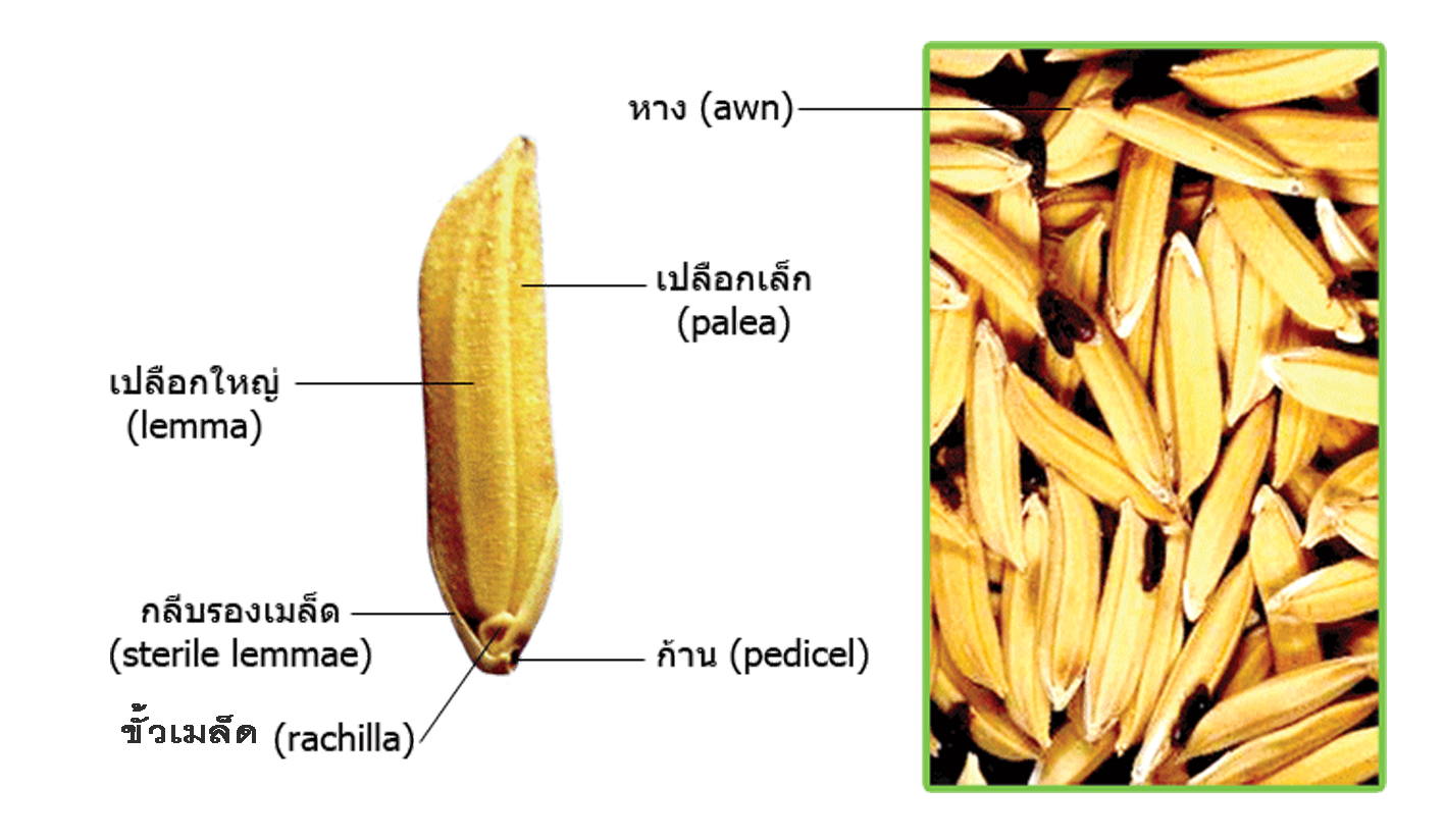 รูปแสดงส่วนประกอบของข้าวเปลือก (whole grain rice) Credit : องค์ความรู้เรื่องข้าว, กรมการข้าว